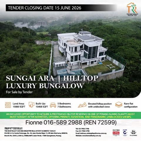 Tender Sungai Ara Hilltop Luxury Bungalow | Tender Sale is a bungalow house (Freehold) located in Sungai Ara, Penang. Built-up area is 15,468 sqft, with 5 bedrooms and 7 bathrooms. Listed for sale at RM70k (RM5 psf).
